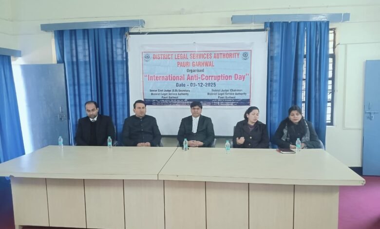 पौड़ी- अंतर्राष्ट्रीय भ्रष्टाचार विरोधी दिवस के अवसर पर जिला न्यायालय परिसर सभागार कक्ष में मंगलवार को विधिक साक्षरता एवं जागरूकता शिविर का आयोजन किया गया। शिविर में नालसा थीम “एक मुट्ठी आसमान” के अंतर्गत लोकपाल तथा अंतर्राष्ट्रीय भ्रष्टाचार विरोधी दिवस से संबंधित लघु वीडियो प्रदर्शित की गयी।